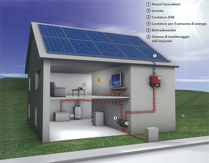 I pannelli fotovoltaici posizionati sul tetto (1) generano elettricità direttamente dalla luce del Sole, senza alcun rumore né emissione. L’Inverter fotovoltaico (2), trasforma la corrente elettrica continua generata dai moduli in corrente alternata adatta alla rete pubblica ed all utilizzo nei comuni elettrodomestici (5). Grazie ad un contatore Enel (3), installato prima del normale contatore per il consumo di energia (4), viene conteggiata la corrente prodotta dall’impianto al fine di ottenere gli incentivi fotovoltaici. Con l’aggiunta di un sistema di monitoraggio (6) Rewatt ha la possibilità di tenere sotto controllo il funzionamento dell’impianto in ogni momento e comunicare al cliente la produzione giornaliera.