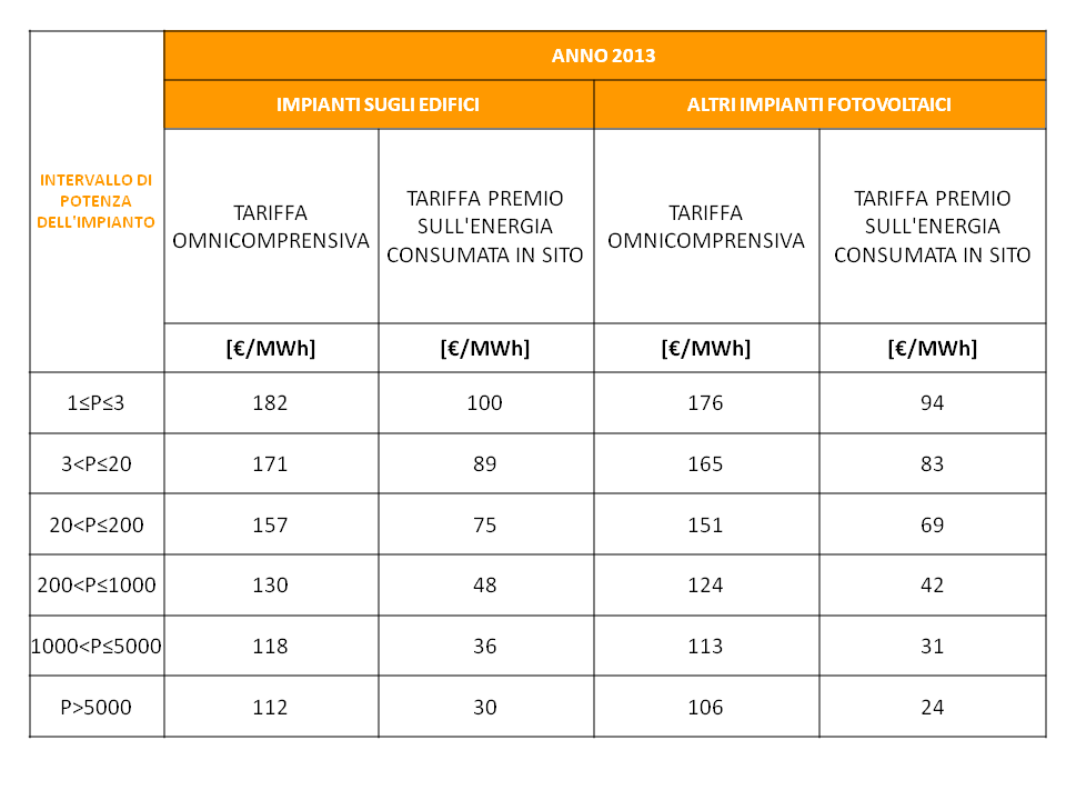 Le tariffe incentivanti corrisposte saranno: